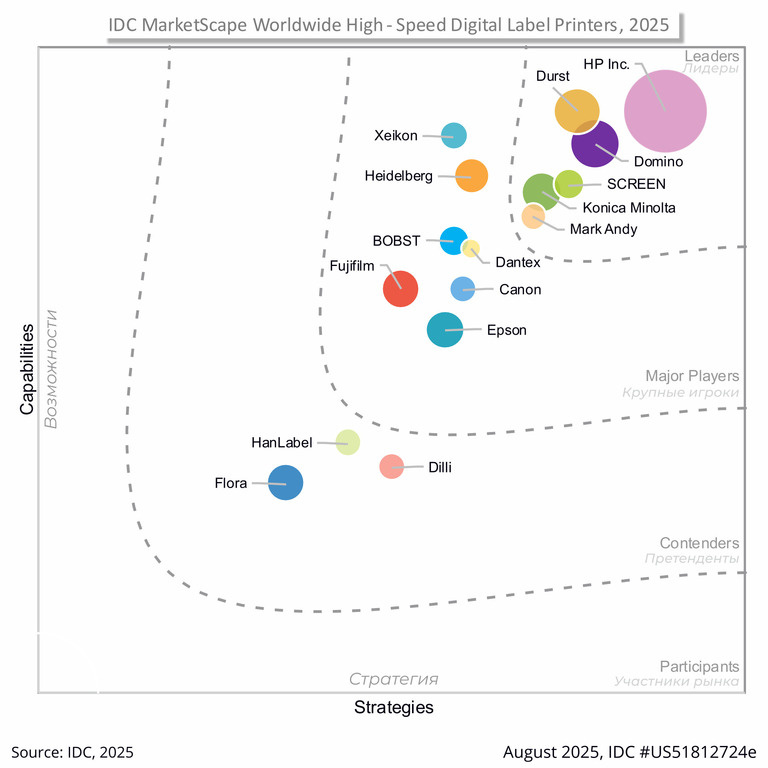 HP на графике выглядит максимально сильным игроком с точки зрения масштаба и траектории развития платформы, Domino и DURST — как индустриально зрелые решения, SCREEN — как технологический фундамент под производительные задачи. Для типографий такой график полезен как навигация по классам решений, но не как инструкция к покупке: реальные критерии выбора всегда лежат в плоскости материалов, цветовых конфигураций, сервиса и стоимости владения.