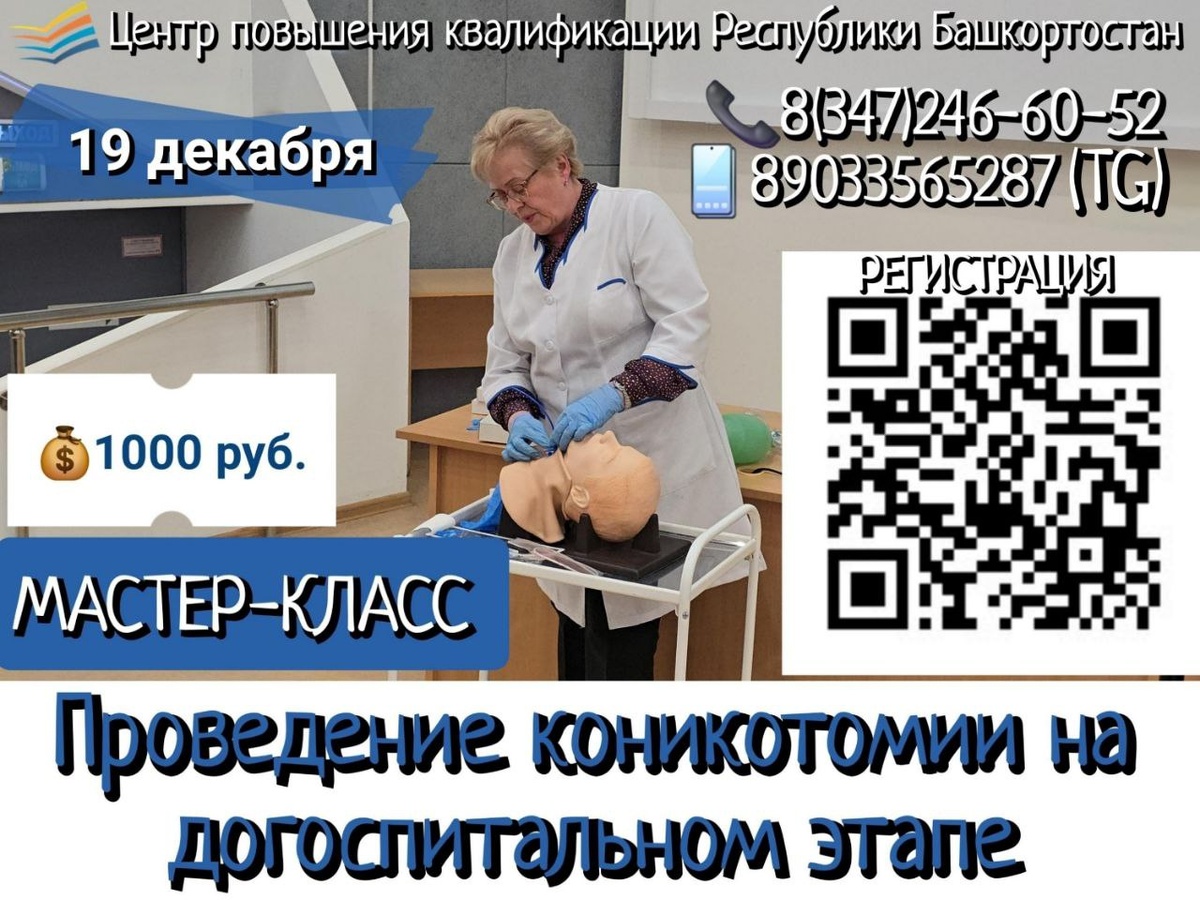 📍Место проведения: г. Уфа, ул. проезд Лесной, 3 корп.1, ГАУ ДПО РБ «Центр повышения квалификации». 🕐Время проведения: 13:00 – 15:30 (по Уфимскому времени) 💰Стоимость участия: 1000 рублей. 🎓Целевая аудитория: медицинские работники с высшим профессиональным образованием по специальностям «Анестезиология-реаниматология», «Скорая медицинская помощь». 📞Контактный телефон: 8(347)246-60-52, 89033565287 (телеграм) 💻Для регистрации пройдите по ссылке: https://clck.ru/37rAK3?