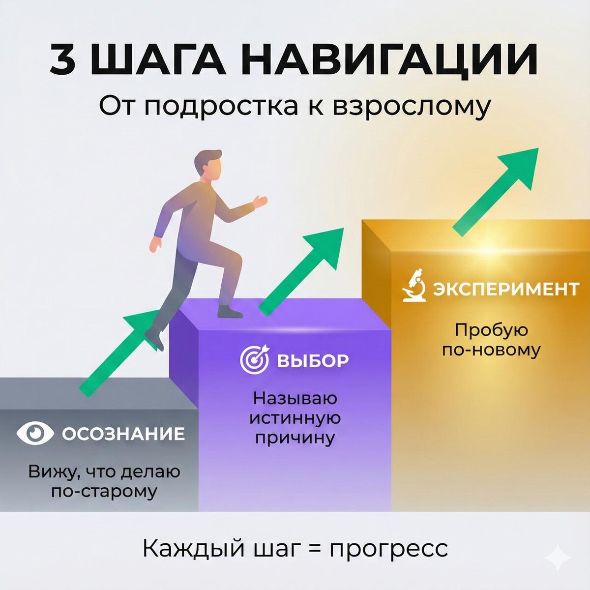 🧭 Понедельник — говорил про переход между "было" и "стало". Вчера — признал: я всё ещё подросток. Мечусь между безопасностью и прорывом. Сегодня — как через это проходить? Если ты застрял в подростковом этапе: Знаешь, что надо по-новому. Но делаешь по-старому. КАК выйти из этого? Есть 3 шага навигации. Не быстрые. Не лёгкие. Но работают. ШАГ 1: ОСОЗНАНИЕ 👁️ "Я вижу, что делаю по-старому". Называю это вслух. Без оправданий. Не "так получается". Не "обстоятельства". А "я делаю это". Пример: "Я выбираю безопасность вместо фокуса." Это больно. Но это правда. Первый шаг — увидеть и назвать. ШАГ 2: ВЫБОР 🎯 "Я выбираю это, потому что..." Называю истинную причину. Не поверхностную. Глубинную. Почему я на самом деле выбираю по-старому? Пример: "Я выбираю много проектов, потому что..." Сначала думал: "Потому что так безопаснее." Копнул глубже. Истинная причина: боюсь снова потерять. У меня был опыт фокусировки на одном. Потерял большие суммы. И я связал: фокус = потеря. Это ложна