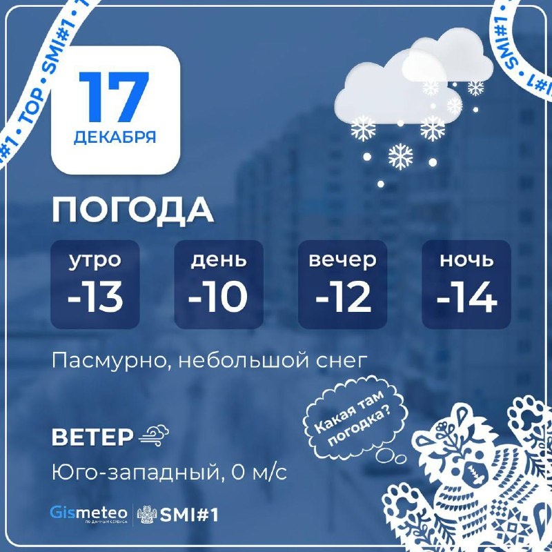 Днем -10 °С, к вечеру похолодает. Снегопад ожидается с 10:20 до 20:00.