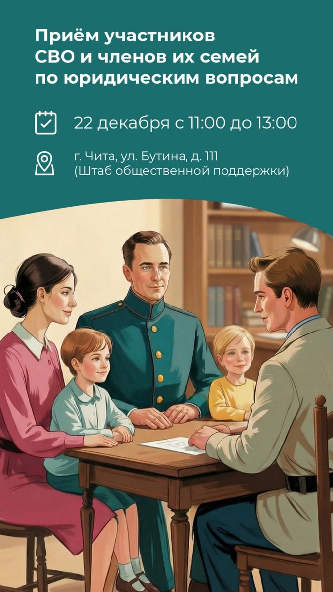 Эксперты проконсультируют воинов по юридическим вопросам Бойцы и их близкие смогут оставить обращение или задать интересующий вопрос. Приёмы будут проводиться с привлечением депутатов всех уровней, а также представителей организаций-партнёров, профильных ведомств и органов исполнительной власти. 🕐22 декабря с 11:00 до 13:00 📍ул. Бутина, д. 111, кабинет 12 💥все консультации бесплатны 🔑записаться на приём можно по телефону 23-00-73 #Новости Предложить публикацию:@zabkulisye_bot
