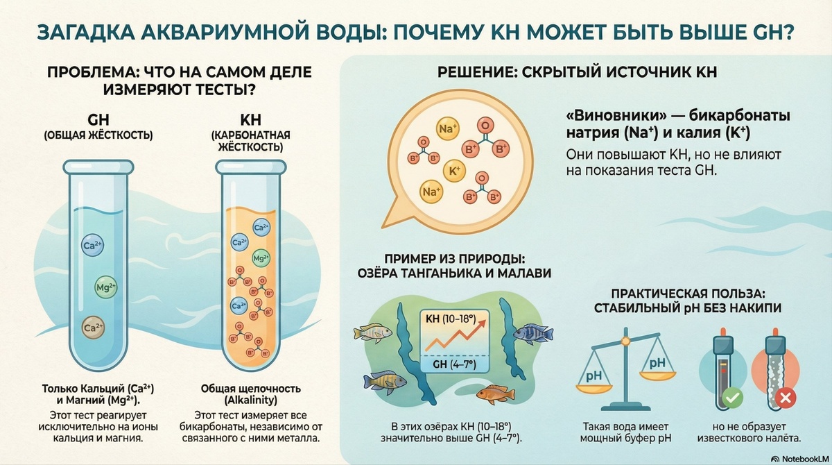 Тесты показывают: карбонатная жёсткость (KH) превышает общую (GH). Вопрос возникает сам собой — как часть может быть больше целого? Это противоречит классической формуле GH = KH + некарбонатная жёсткость. Но в реальной гидрохимии такое возможно и встречается регулярно. Разборем по химическим механизмам. ### Что именно измеряют GH и KH GH (общая жёсткость) — концентрация двухвалентных катионов, преимущественно Ca²⁺ и Mg²⁺. Тесты используют комплексонометрию с индикатором. Натрий Na⁺ и калий K⁺ не учитываются. KH (карбонатная жёсткость) — общая кислотная буферная ёмкость до pH ≈4,3. Тест титрует кислотой все анионы, нейтрализующие H⁺: преимущественно HCO₃⁻ и CO₃²⁻, независимо от катиона. Результат выражают в эквивалентах CaCO₃, но химически KH фиксирует все бикарбонаты и карбонаты, включая NaHCO₃ и KHCO₃. ### Почему KH может превышать GH: химический механизм Классическая временная жёсткость образуется гидрокарбонатами Ca(HCO₃)₂ и Mg(HCO₃)₂. Здесь каждый HCO₃⁻ связан с Ca²⁺/Mg²⁺, п