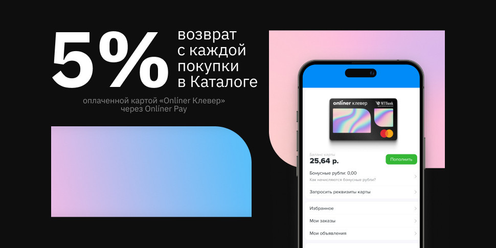 Вы получаете возврат 5% с каждой покупки в Каталоге, оплаченной картой «Onlíner Клевер» через Onlíner Pay (за исключением покупок, частично или полностью оплаченных бонусными рублями). Бонусные рубли начисляются вам сразу после доставки и выкупа товара.