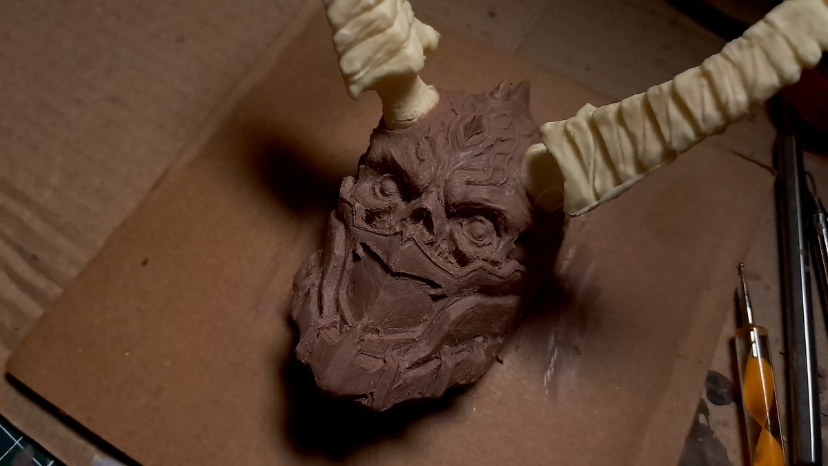 Делюсь процессом, да запоздало Это еще на моменте лепки, сейчас уже достал из фломы, но даже пробных не отливал Рога просто черновые, будут литься под основной цвет Вместе с рогами довольно крупный, 3/4 ладони. Будет магнит От начала и до конца лепили под стрим