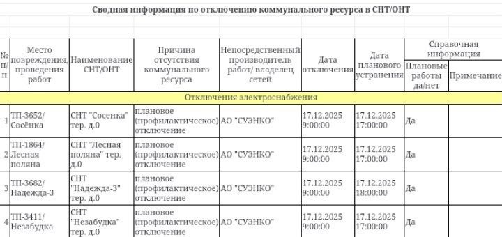 Информация по плановым отключениям в СНТ/ДНТ на 17.12.2025 от ЕДДС города Тюмени