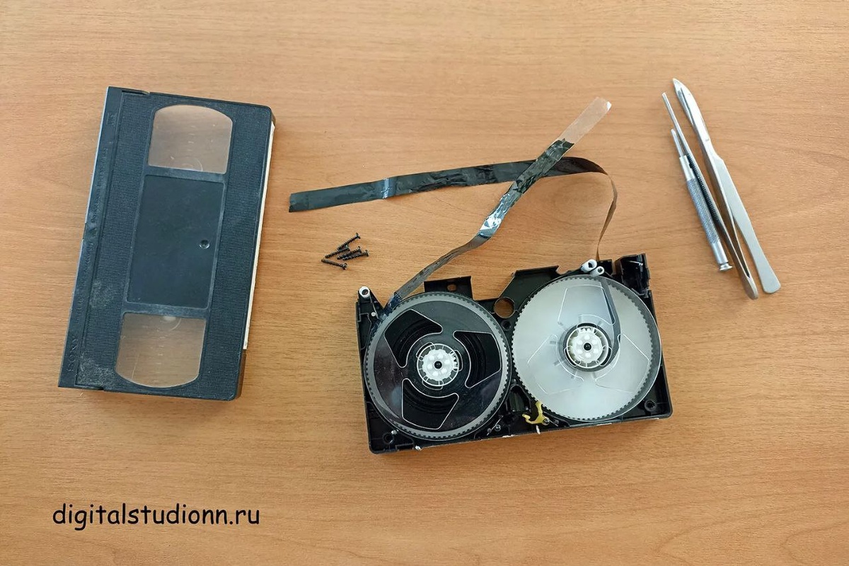 Ремонт видеокассеты, склейка ленты, приведение в рабочее состояние перед оцифровкой. На фото: VHS, 1990-е годы Ещё об этом: https://digitalstudionn.ru/remont-video-audiokasset