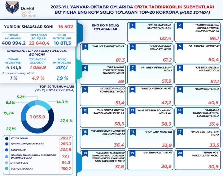 По данным комитета, из общего объёма поступлений 1 трлн сумов приходится на 20 организаций. Их совокупный товарооборот превысил 4,1 трлн сумов, а сумма применённых ими налоговых льгот составила 207,1 млрд сумов. В ведомстве отмечают, что подобная статистика используется для анализа структуры налоговой базы в сегменте среднего бизнеса, оценки отраслевой концентрации поступлений и эффективности мер налогового администрирования.