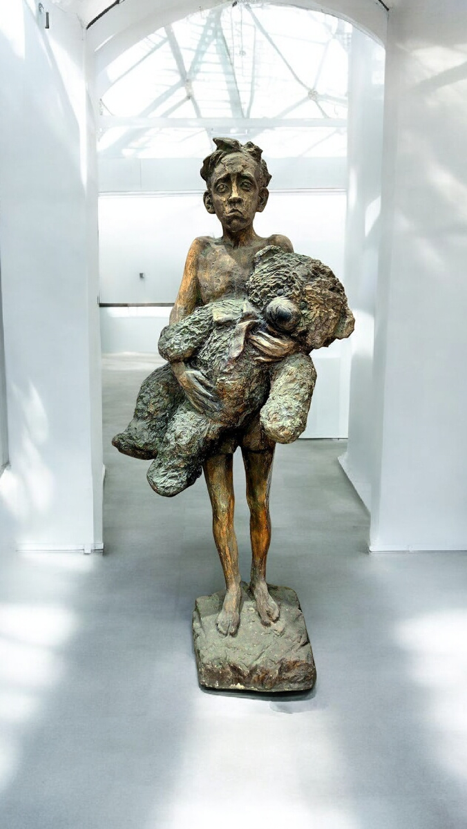 Скульптура Анны Сосенской «Мама, мне страшно» – это пронзительный, почти физически ощутимый крик о помощи, воплощенный в гипсе. Произнесённое в тишине название работы «Мама, мне страшно» звучит как эхо отчаяния, мгновенно устанавливая глубокую эмоциональную связь со зрителем, предвосхищая образ детской уязвимости и исконной, жизненно важной потребности в защите. Перед нами предстает фигура ребенка – худенького, почти изможденного, с босыми ногами, стоящего на неровном, словно сколотая поверхность, постаменте. Каждая деталь его облика говорит о глубочайшей тревоге. Лицо – это сосредоточие всех переживаний: широко открытые, напуганные глаза, в которых застыл немой вопрос, глубокие мимические «заломы» на лбу, опущенные уголки рта передают неподдельный страх и растерянность. Его поза не статично, но кажется все его жесты словно застыли в момент отчаянной мольбы, обращенной одновременно вовне, к матери, внутрь себя и к игрушке - последнему оплоту утешения. Особое внимание