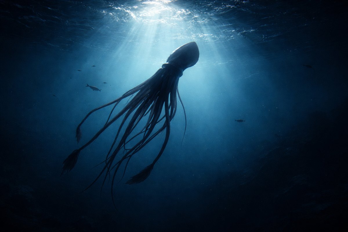 Важно сразу уточнить: гигантский кальмар — не криптид и не легенда. Его существование подтверждено множеством находок и видеозаписей. Однако почти всё, что мы знаем о нём, получено случайно — при выбросах на берег, в сетях или при редчайших глубоководных съёмках. В естественной среде Architeuthis dux почти не наблюдаем.