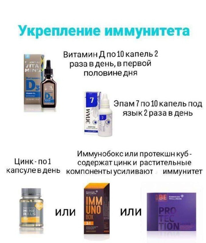 😀3D Protection Cube" 1 пакетик в день. Или Имуннобокс 😀Новомин по 1-2 капсуле 1 раз в день. 😀Органический селен по 1 капсуле в день. 😀Эльбифид по 1 капсуле в день. 😀Очищающий фитосорбент" 1 ч.л. в 200 мл теплой воды на ночь. Курс рассчитан на 1-2 месяца. Курс можно повторять 2-3 раза в год.