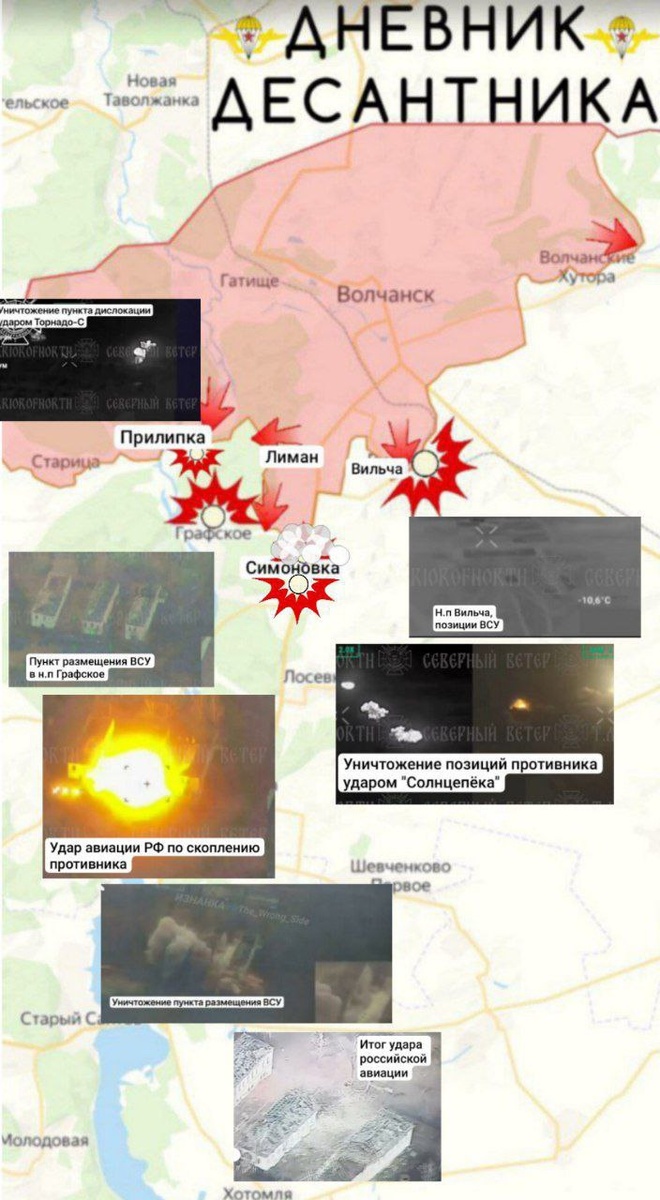 Докладывает Добрый 🫡 ВС РФ продолжают продвигаться по населенным пунктам прилегающим к Волчанску, наращивая наступление и расширяя зону контроля. Наступление поддерживает российская артиллерия, "Солнцепёки", расчеты ударных БПЛА "Герань-2" и ВКС РФ. Используя погодные условия противник пытается провести ротацию, разведка ВС РФ выявляет боевые группы и комплексным огневым поражением срывает замысел ВСУ. 🔥 В Харьковской области расчёты разведывательно - ударного комплекса "ZALA" "Ланцет" уничтожили радиолокационную станцию "Мангуст", которая предназначалась у врага для контрбатарейной разведки. ( видео 1) 🔥 В Харьковской области продолжается уничтожение украинских автомобилей ВСУ вместе с водителям и пассажирами. Работают расчеты 68 дивизии ЛенВО. На видео 2 уничтожение 18 единиц транспорта противника различного типа. ▫️ В населенном пункте Вильча продолжаются упорные бои, наши штурмовые группы выдавливают противника. Северная часть села перешла под наш контроль, в южной части нас