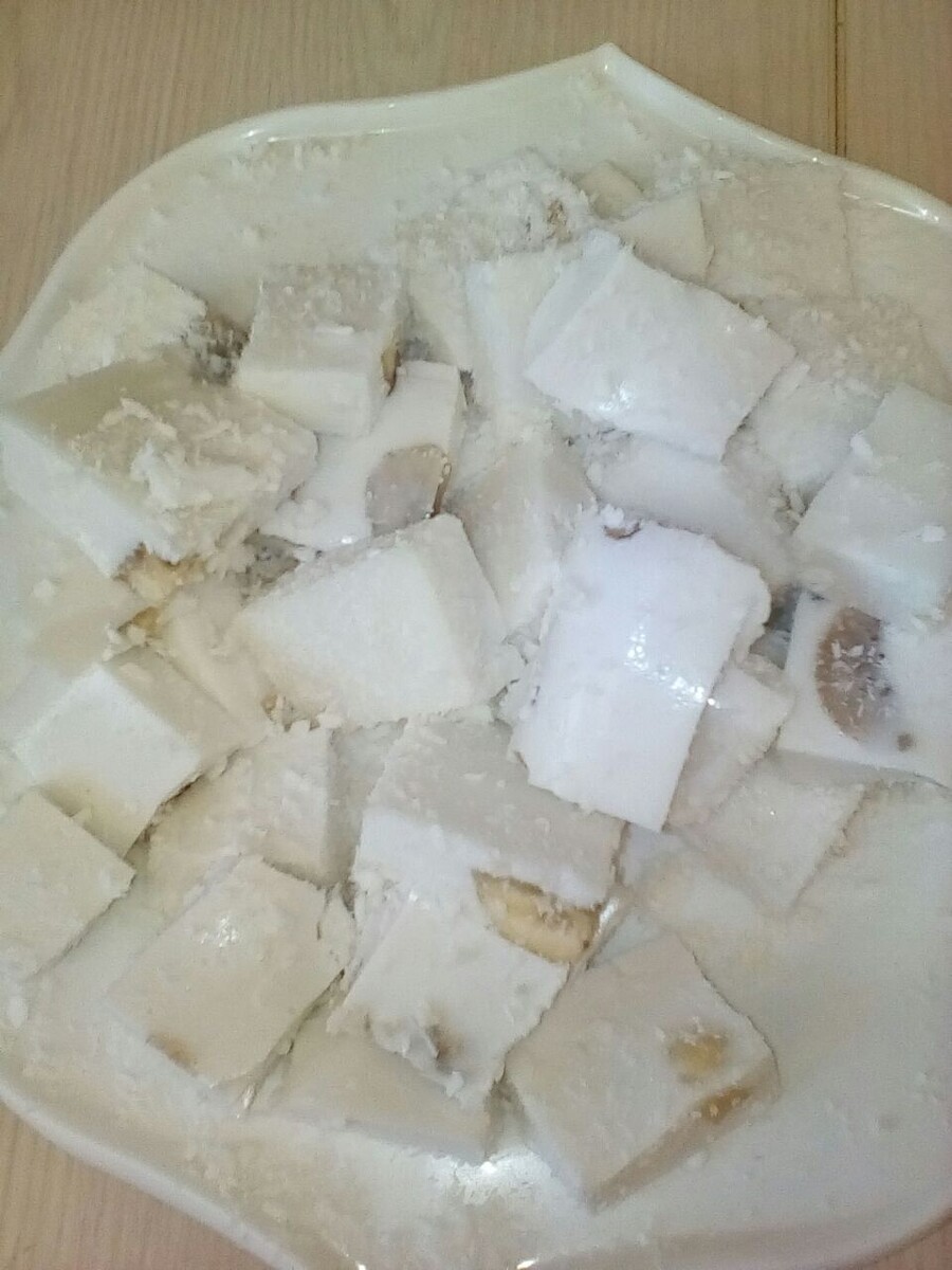 - На следующий день острым ножом отделите края. Переверните на разделочную доску. Нарежьте на кусочки нужной формы. Обваляйте в кокосовой стружке.