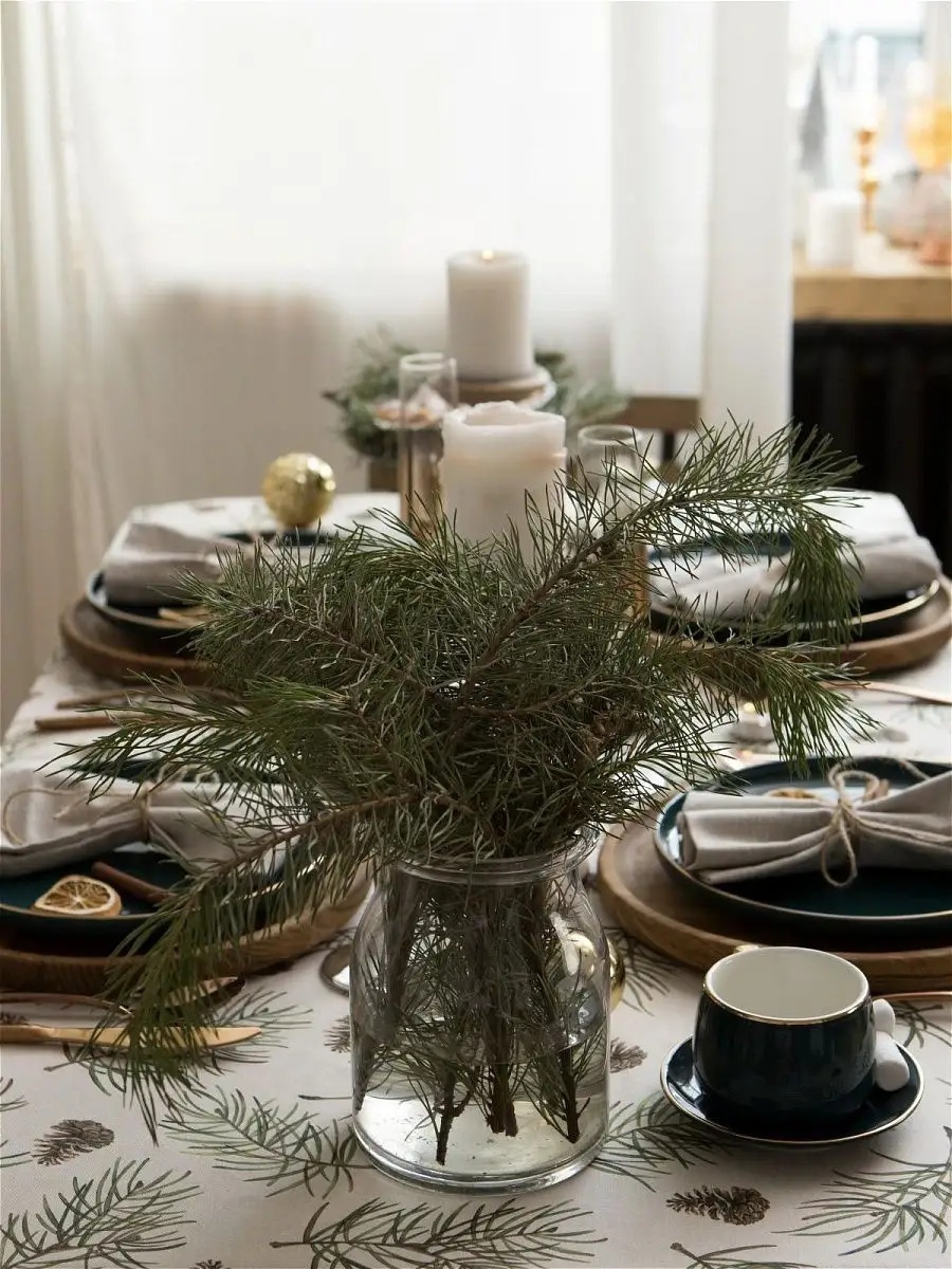 Дизайн с нежным рисунком еловых веток и шишек задает тон всей сервировке, создавая мгновенное ощущение зимней сказки и лесного уюта. Такой принт не выглядит навязчивым или детским, он сдержанный, графичный и удивительно атмосферный. Скатерть становится идеальным нейтральным фоном, который не соперничает с посудой, а, наоборот, выгодно оттеняет её, позволяя остальным элементам декора раскрыться в полной мере.