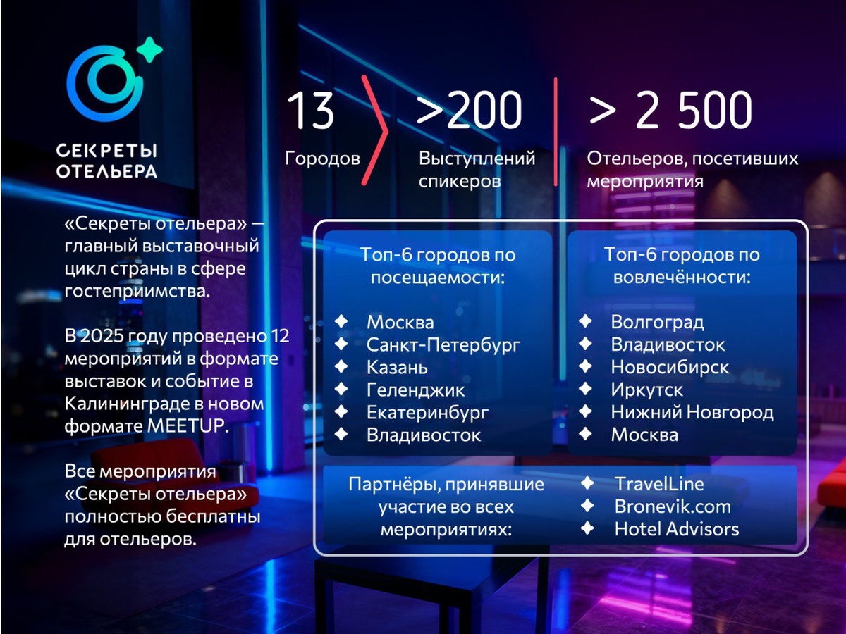 На этой неделе мы делились с вами планами на будущее, а теперь настало время оглянуться назад и подвести итоги уходящего года. Давайте начнем с наших любимых мероприятий и посмотрим, чем запомнился нам этот год через призму цифр и данных. В 2025 году мы провели 13 ярких событий, которые собрали более 2 500 профессионалов индустрии. Посещаемость остается одним из главных показателей интереса к нашим мероприятиям, и, как и ожидалось, в топ-6 лидеров попали города федерального значения и крупные мегаполисы с развитой инфраструктурой. Но цифрами посещаемости дело не ограничивается. Мы также внимательно отслеживаем уровень вовлеченности — это доля отельеров, реально посетивших события, по сравнению с общим числом зарегистрированных участников. Здесь данные удивляют: в топ-6 попали города, которые нельзя назвать лидерами по количеству гостиниц, но их представители проявили максимальный интерес к выставке "Секреты отельера". Новый сезон уже на горизонте, и впереди еще больше насыщенных мер