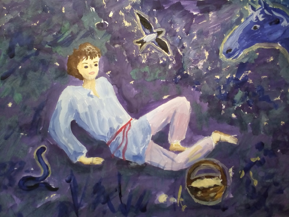 Начинал плести из золотой проволоки венцы на голову для девушек –все только ахали, слепил из глины кувшин для матери – за водой ходить – красоты необыкновенной, и вода в том кувшине всегда была свежая. Пойдёт объезжать коня – даже самый дикий конь его слушается. А коли у коня или коровы болячка вскочит, только Кастусь руку приложит – всё проходит. И любил Кастусь животных и птиц – всем помогал. Уж такая добрая у него была Душа.