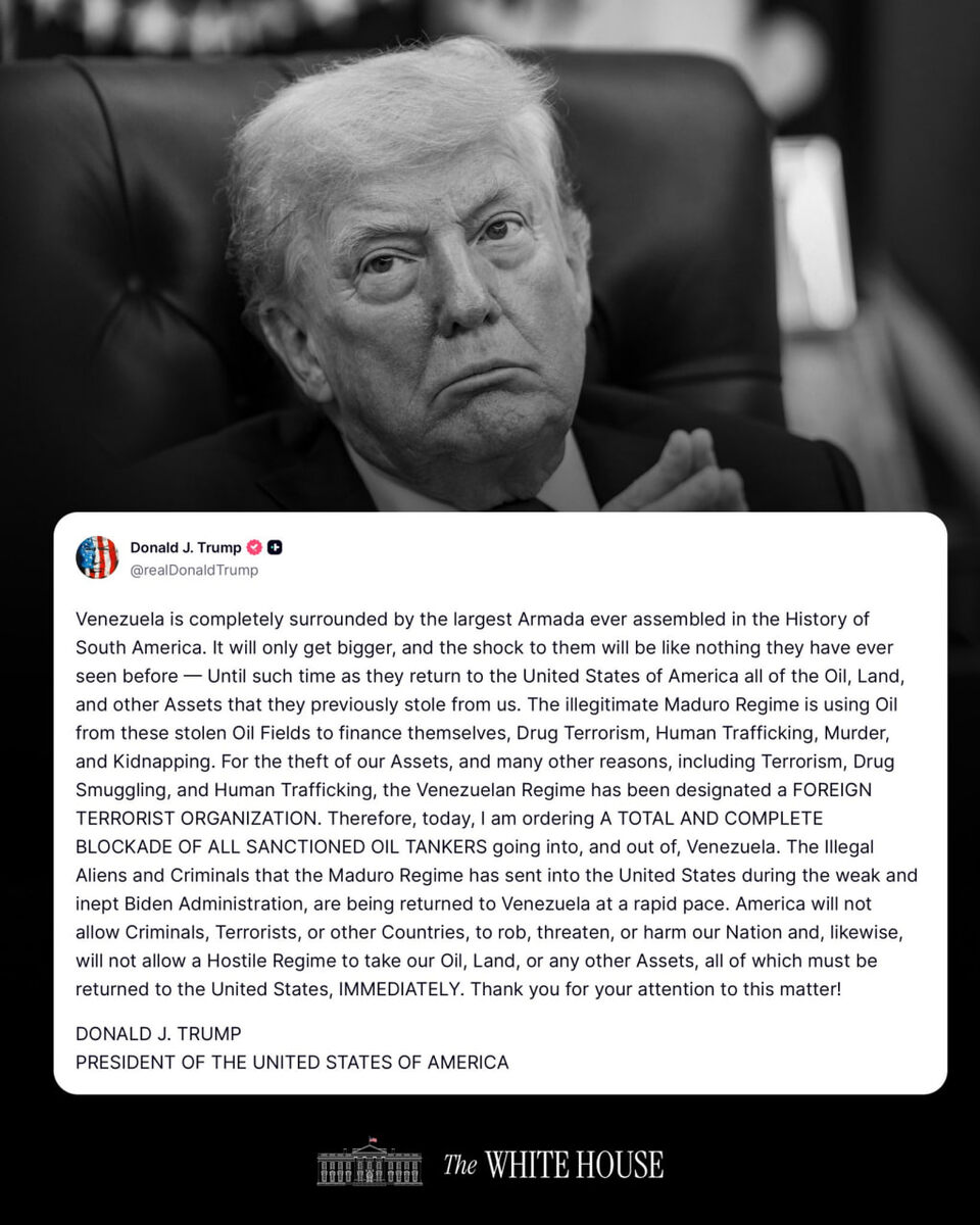 Трамп (в своей стилистике) объявил ультиматум Венесуэле: заявил, что США собрали у её берегов крупнейшую в истории Южной Америки военно-морскую группировку и будут наращивать давление, пока Каракас не «вернёт» американцам нефть, землю и активы, которые, по его версии, были «украдены». Режим Мадуро он описывает как преступный — связывает его с наркотрафиком, терроризмом и торговлей людьми — и на этом основании сообщает о решении: ввести полную блокаду всех «санкционированных» нефтяных танкеров, заходящих в Венесуэлу и выходящих из неё, плюс ускорить депортацию венесуэльских нелегалов и преступников обратно в Венесуэлу. Но никакого вторжения, конечно, не будет...