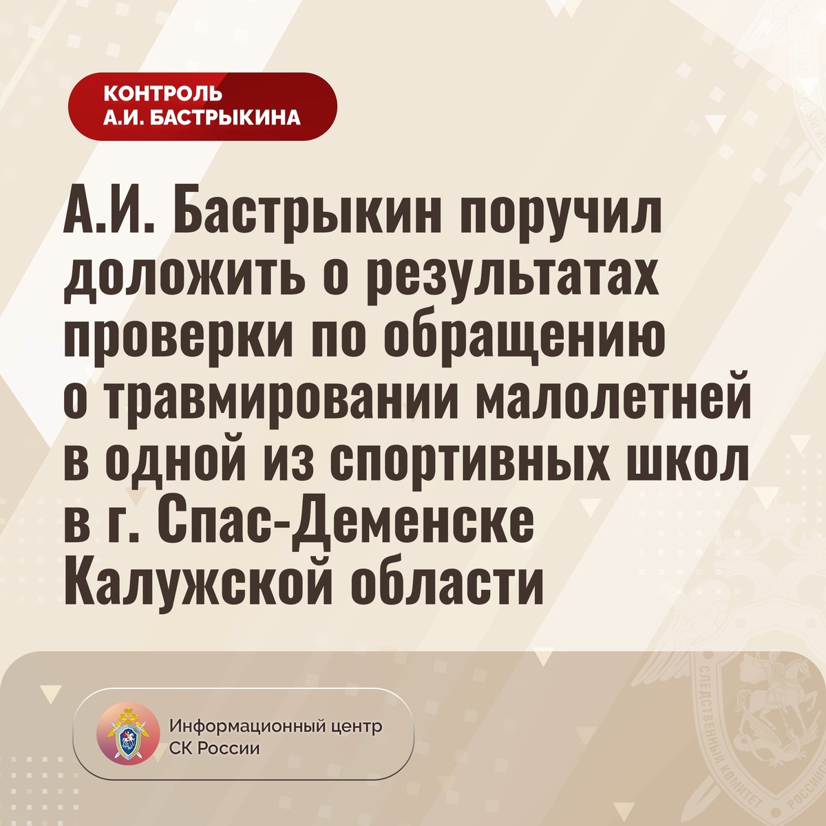 А.И. Бастрыкин поручил доложить о результатах проверки по обращению о травмировании малолетней в одной из спортивных школ в г. Спас-Деменске Калужской области В комментариях в аккаунте приёмной Председателя СК России А.И. Бастрыкина «ВКонтакте» размещено обращение жителя Калужской области по вопросу травмирования его 12-летней дочери. В декабре текущего года во время тренировки по баскетболу в одной из спортивных школ в городе Спас-Деменске ученик применил в отношении девочки физическую силу, в связи с чем она получила травму. При этом сотрудники образовательного учреждения мер к оказанию ей медицинской помощи не приняли, о произошедшем родителям не сообщили. Позднее пострадавшая с переломом госпитализирована, ей потребовалось оперативное вмешательство. В СУ СК России по Калужской области начата процессуальная проверка. Председатель Следственного комитета Российской Федерации Александр Иванович Бастрыкин поручил руководителю СУ СК России по Калужской области Марку Сергеевичу Харламову