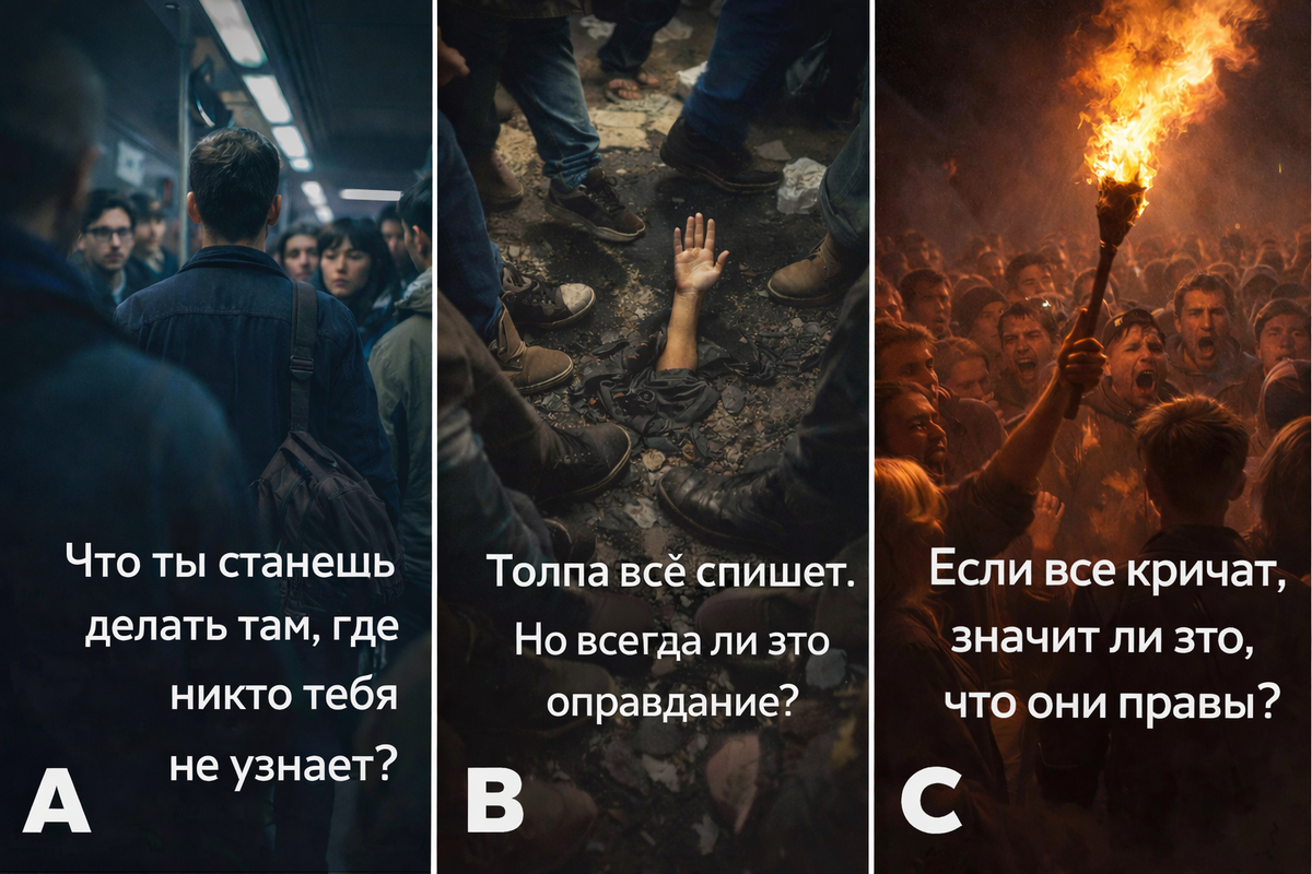 Но стоит оказаться в толпе — и он кричит, бежит, покупает, рискует или поддерживает то, что в одиночку счёл бы странным или опасным. Это не слабость характера.