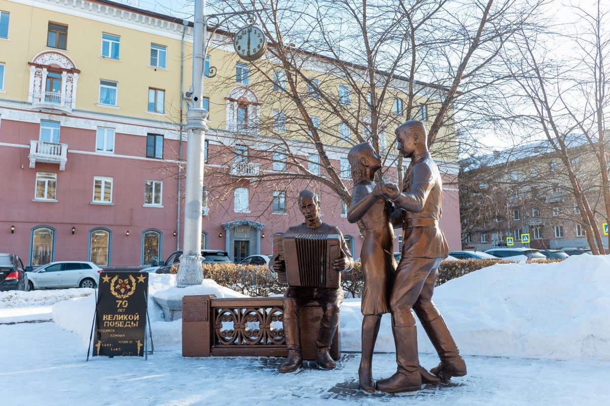 Словно замерла в ритме зимнего вальса знаменитая скульптура «В 6 часов вечера после войны» на улице Весенняя в Кемерове