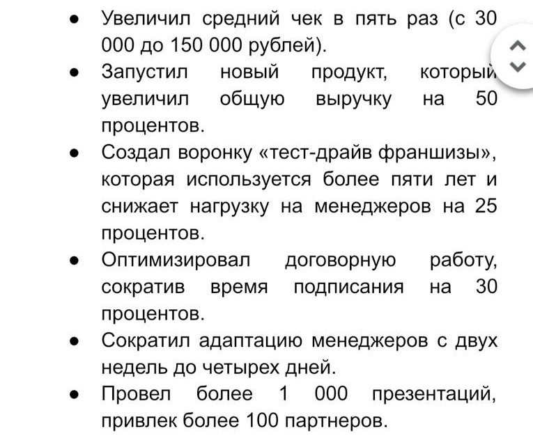 Видно, что кандидат не просто контролировал продажи и подчиненных. Он создавал системы под ключ, фокус на поиске новых возможностей и увеличение прибыли - это важная компетенция для руководящих позиций.