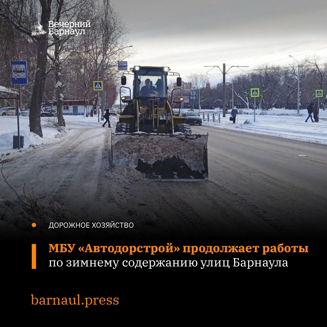17 декабря в дневную смену снег на остановках и пешеходных переходах убирают на проспектах Калинина и Комсомольском, а также на улицах Профинтерна, Пионеров, Германа Титова, Эмилии Алексеевой, Попова, Солнечная Поляна, в Северном Власихинском проезде. Тротуары чистят на улицах Глушкова, Германа Титова, Солнечная Поляна, Сергея Ускова, Взлётной, Сиреневой, Балтийской, на проспектах Космонавтов, Красноармейском, Социалистическом, на площади Победы. Посыпка дорог с последующим прометанием проводится на улицах Загородной, Попова, Малахова, Солнечная Поляна, Юрина, Антона Петрова, а также на проспекте Ленина, Змеиногорском тракте, в посёлке Южном. Фото: barnaul.org 📬 Подписывайтесь на наш канал в MAX @barnaul