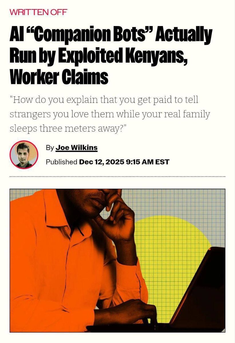 кенийцы 😡 Один человек просто искал подработку, чтобы обеспечить свою семью, а его заставили одновременно флиртовать от имени 3-5 ИИ-девушек и рассказывать всякие непристойности. Работа была ужасной: некоторые смены длились несколько суток, а главная цель заключалась в том, чтобы заставить богатых пользователей продлить подписку. Судя по журналистскому расследованию, таких ИИ-работников из Кении десятки, если не сотни тысяч. Если вам нравится, как ИИ-бот флиртует с вами, подумайте еще раз 💀 NeuroFlux #ИИ #фейк #NewMediaServices #разоблачение #Кения #подработка #интимныедиалоги #журналистика #технологии #подписка