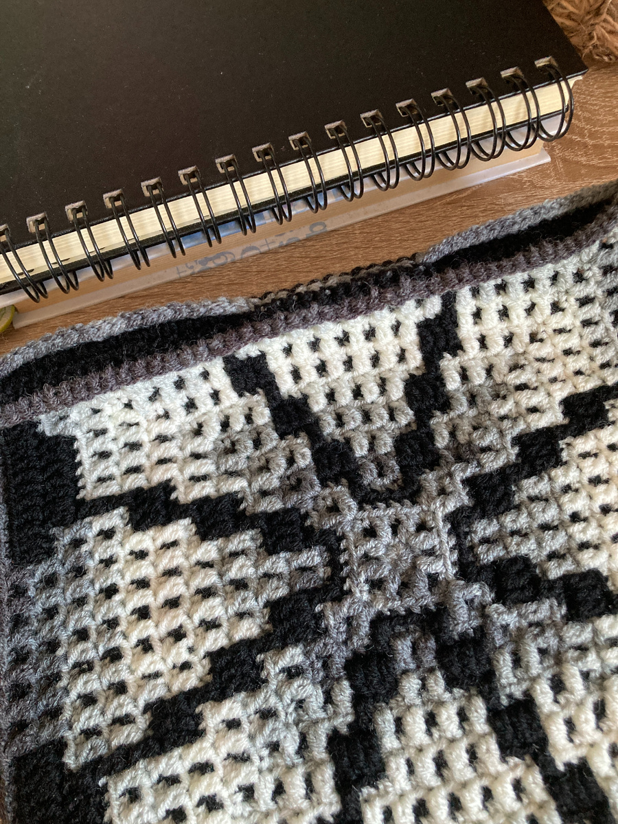 При вязании в гобеленовой технике мозаики крючком есть одна особенность, которую не сразу видно: на изнаночной стороне изделия образуются такие, не знаю как правильно называются, то ли складочки, то ли пустоты и получается как бы двойное вязаное полотно. Если в мозаичной схеме гобеленовые участки небольшие, порядка пяти-семи столбиков с накидом подряд, то особой разницы не заметно, но если участков много и они большие, сразу становится видны эти самые складочки, а если гобеленовые ряды идут подряд друг над другом, то вообще получается какая-то "гармошка". Конечно, если изделие в дальнейшем использовать, допустим, как накидку, это может и не важно, но при использовании как плед, лично мне хотелось бы, чтоб таких складок не было. Сейчас вяжу большой квадратный мотив, примерно будет 75 рядов, где фон гобеленовый, а узор - вафельный, и вот так выглядит изнаночная сторона мотива. Фото поближе, получаются вот такие складочки, а при вязании более толстой пряжей складочки будут ещё больше. Х