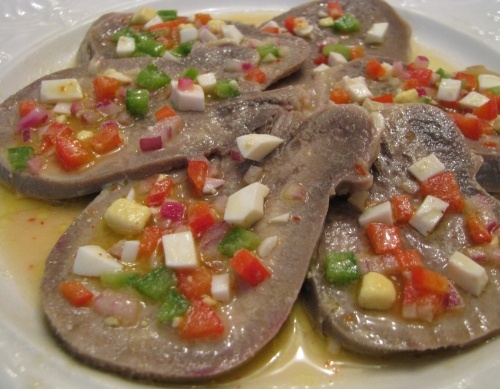 Предварительно сваренный и охлажденный язык нарежьте тонкими ломтиками и разложите в один слой на подходящей по размеру тарелке. Для основы соуса винегрет взбейте оливковое масло с уксусом до образования легкого по текстуре соуса. Добавьте соль, красный острый молотый перец и все остальные ингредиенты (все предварительно очень мелко нарезается). Полученной смесью залейте ломтики отварного языка, накройте и оставьте на несколько часов в холодильнике настояться. Подавайте в качестве холодной закуски. Видеорецепт смотрите здесь - https://rutube.ru/video/9b353e5a002875cfaf7407d265b0e68a/