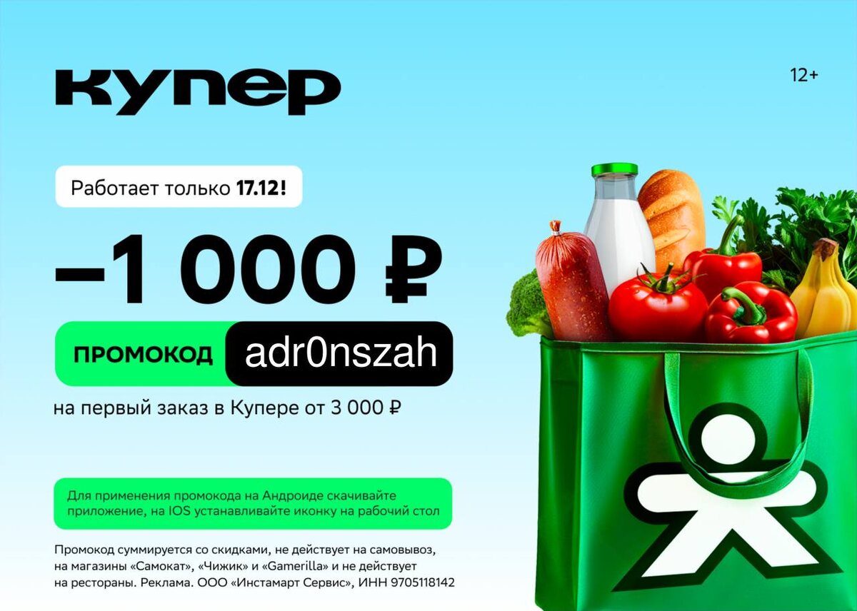 ! ❗️Только 17 декабря в Купере по промокоду: ♦️ adr0nszah ♦️ получите скидку ♦️🔺🔺🔺🤑 на первый заказ от 3000 ₽. *Работает в приложении и веб-версии, суммируется с акциями. Не действует в магазинах "Самокат" и "Чижик", а так же на рестораны. При выборе опции самовывоз и в городах Ишим и Новоалтайск. ✅ Канал по скидкам 🔣 Бот с промокодами