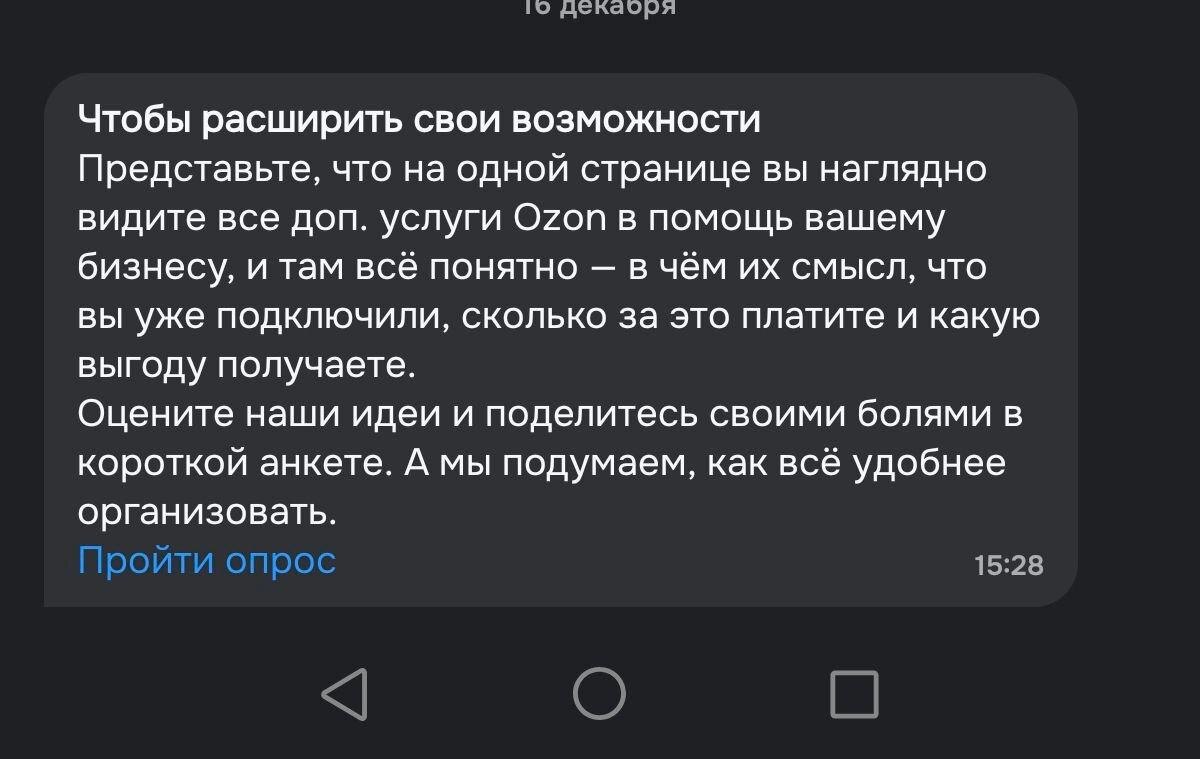 » — показать селлеру все его расходы в одном месте Идея звучит красиво: одна страница → все доп. услуги → сколько платишь → какую «выгоду» получаешь. Но есть нюансы. Во-первых, для многих селлеров это будет холодный душ. Когда на одном экране видно, сколько маркетплейс забирает: комиссии, логистика, реклама, хранение, услуги, галочки. Во-вторых, Ozon объективно зарабатывает на забывчивости: — не снял галочку — не отключил услугу — не заметил списание А тут внезапно — прозрачность. Поэтому у меня сильное ощущение, что дальше опроса это не уедет. Слишком странно добровольно стрелять себе в ногу и показывать селлеру реальную экономику торговли. Но если вдруг сделают — это будет самый честный экран в личном кабинете за все годы. Marketplace_biz - отдай свой буст каналу