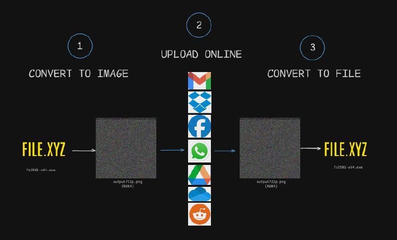 пикчу. Зачем нужна эта имба: • Обход фильтров и блокировок — вместе .exe, .zip или .docx присылаем обычные изображение. • Незаметная передача файлов — PNG не вызывает подозрений. • Удобная архивация — удобно для визуальной сортировки, предпросмотра и каталогов. • Обучение — наглядный пример, как можно кодировать данные в цвета. Забирайте тут.