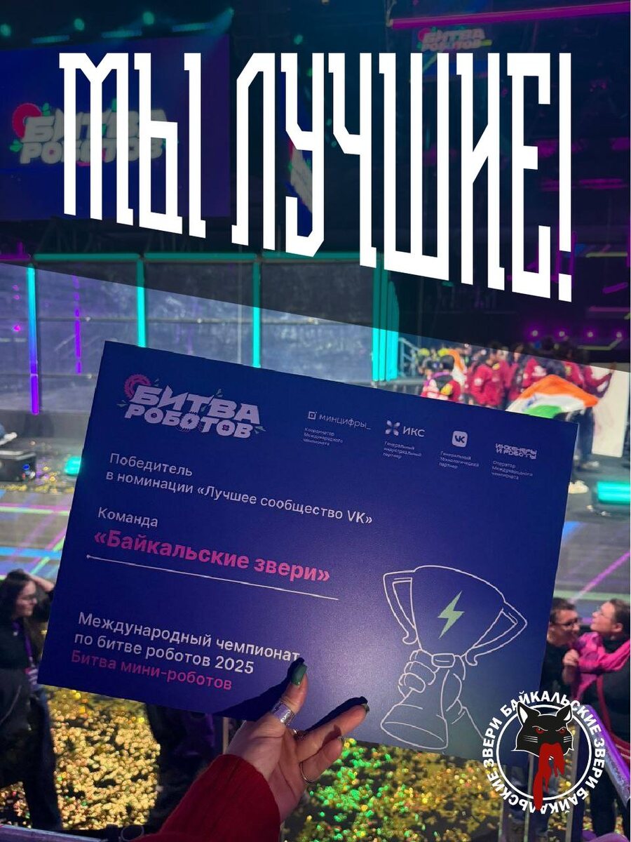 💙 Команда ИРНИТУ по битве роботов «Байкальские звери» — завоевала престижную награду «Лучшее сообщество VK» на международном чемпионате «Битва роботов – 2025» 🤖 Церемония награждения прошла 13 декабря в парке Москино в рамках финального этапа чемпионата. Приз команде вручил робот Грин с искусственным интеллектом — разработка Сбера, а на сцене «Байкальских зверей» представила Дарья Домбровская, заместитель начальника управления по молодёжной политике ИРНИТУ и куратор команды. Весь сезон ребята делились закулисьем создания боевых роботов в разных категориях, рассказывали о технических решениях и освещали ключевые события робототехнической индустрии. Благодаря живому контенту, вовлечённости и поддержке подписчиков сообщество стало настоящим центром притяжения для всех, кто увлечён робототехникой! Следите за «Байкальскими зверями» и будьте в курсе их новых проектов, побед и испытаний 📲