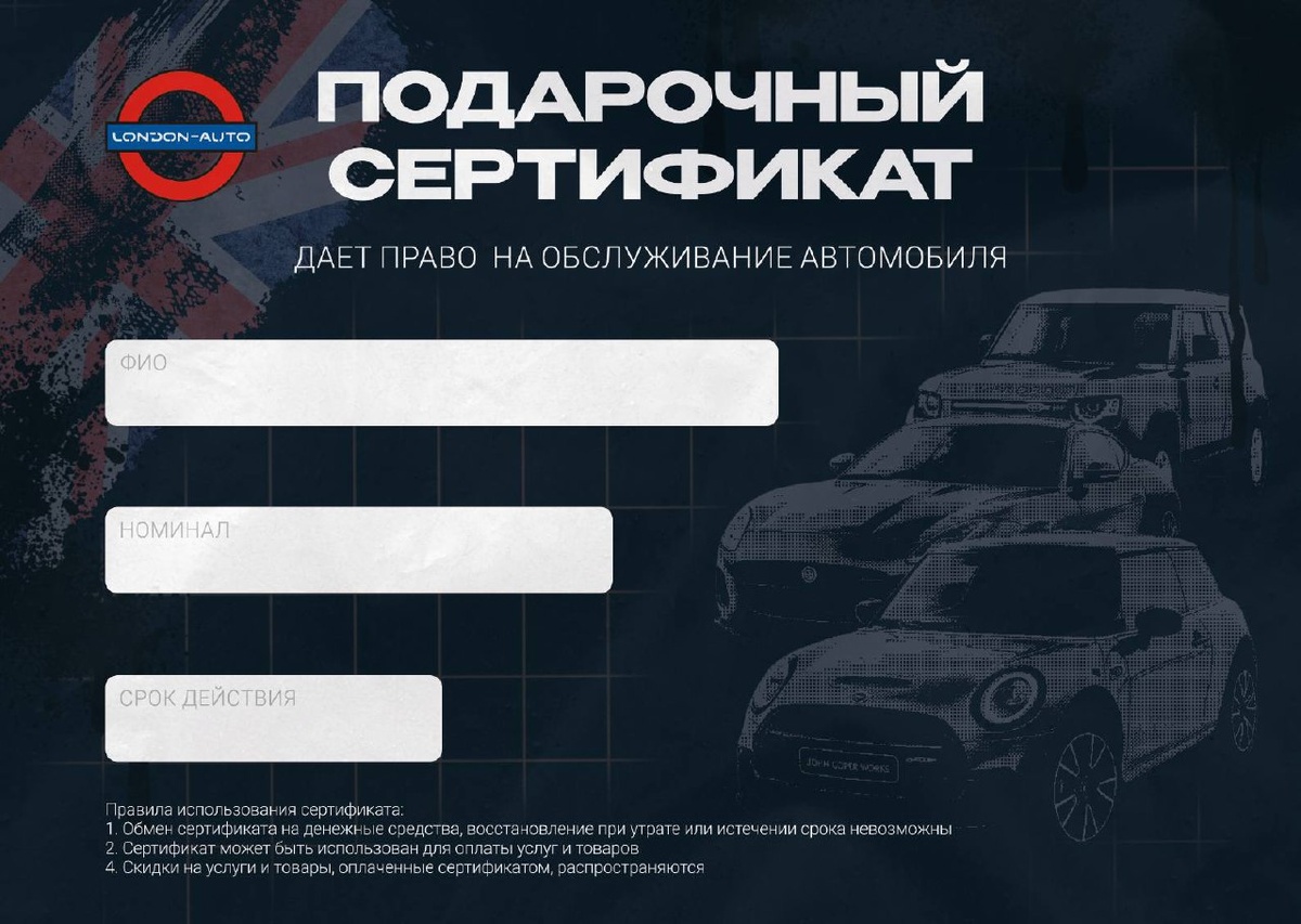 ! Мучаетесь с идеей презента на Новый год? В наших тех центрах Лондон Авто появились подарочные сертификаты💥 Номинал выбираете сами! Отличный подарок для друзей и близких, кто ценит надежное обслуживание своего автомобиля. За подробностями звоните нам Санкт-Петербург 📍 Шафировский проспект 30 стр.9 – ПИТЕР +79251987878 @london_auto_spb Москва 📍ул. 5-яКабельная 2с6 — ВОСТОК +79261251367 @london_auto_mini 📍Дмитровское ш9с4 — СЕВЕР +79854545007 @london_auto_MINI_Sever 📍ул. Автозаводская 20с8 — ЮГ +79683737037 @London_Auto_South_JLR_Mini 📍Осташковское ш 1влБ с20 — МЫТИЩИ +79251411399 @london_auto_MINI_Medv КУЗОВНОЙ РЕМОНТ +79258503737 @Kuzova_Remont