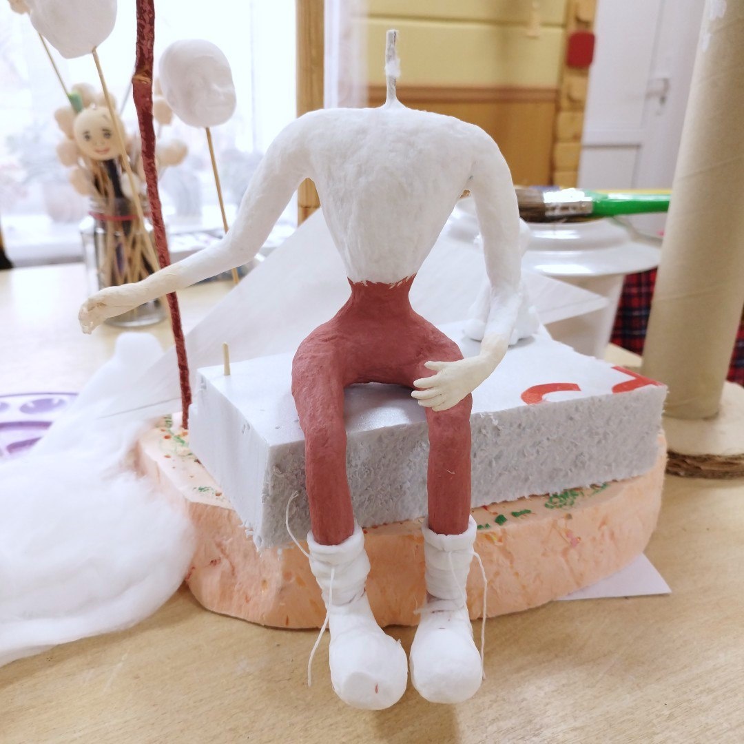Онучи надела на бабулю (обмотала и сверху обвязала пока мокрая вата крепкой ниткой). Деду надела штаны из окрашенной ваты.