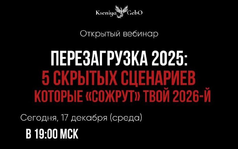 Чуда не случится: календарь сменится, а ваши нейронные связи останутся прежними. Тревога, психосоматика, день сурка - это не «черная полоса». Это система, в которой вы застряли и 1 января она никуда не исчезнет. Я приглашаю вас выйти из этого замкнутого круга. 🗓 Сегодня, 17 декабря (среда) в 19:00 МСК Открытый вебинар: «Перезагрузка 2025: 5 скрытых сценариев, которые "сожрут" твой 2026-й». Вам точно нужно на эфир, если вы: • Живете в режиме «Надо», а тело кричит «Хватит» (психосоматика, усталость) • Прочитали тонну книг, прошли курсы, всё понимаете головой, но... продолжаете жить по-старому Программа: 🧹 Инвентаризация: вскроем 5 неочевидных сценариев, которые воруют вашу энергию (вы удивитесь, узнав себя) 📊 Диагностика: определим вашу точку по системе Вектор ГебО. Где вы реально: в Минусе (выживание), в Ноле (стабильность) или в Плюсе (управление) 📋 План выхода: покажу, как работает система «В Контакте с Собой» (ВКС) - как соединить Психику и Тело, чтобы получить устойчивый р