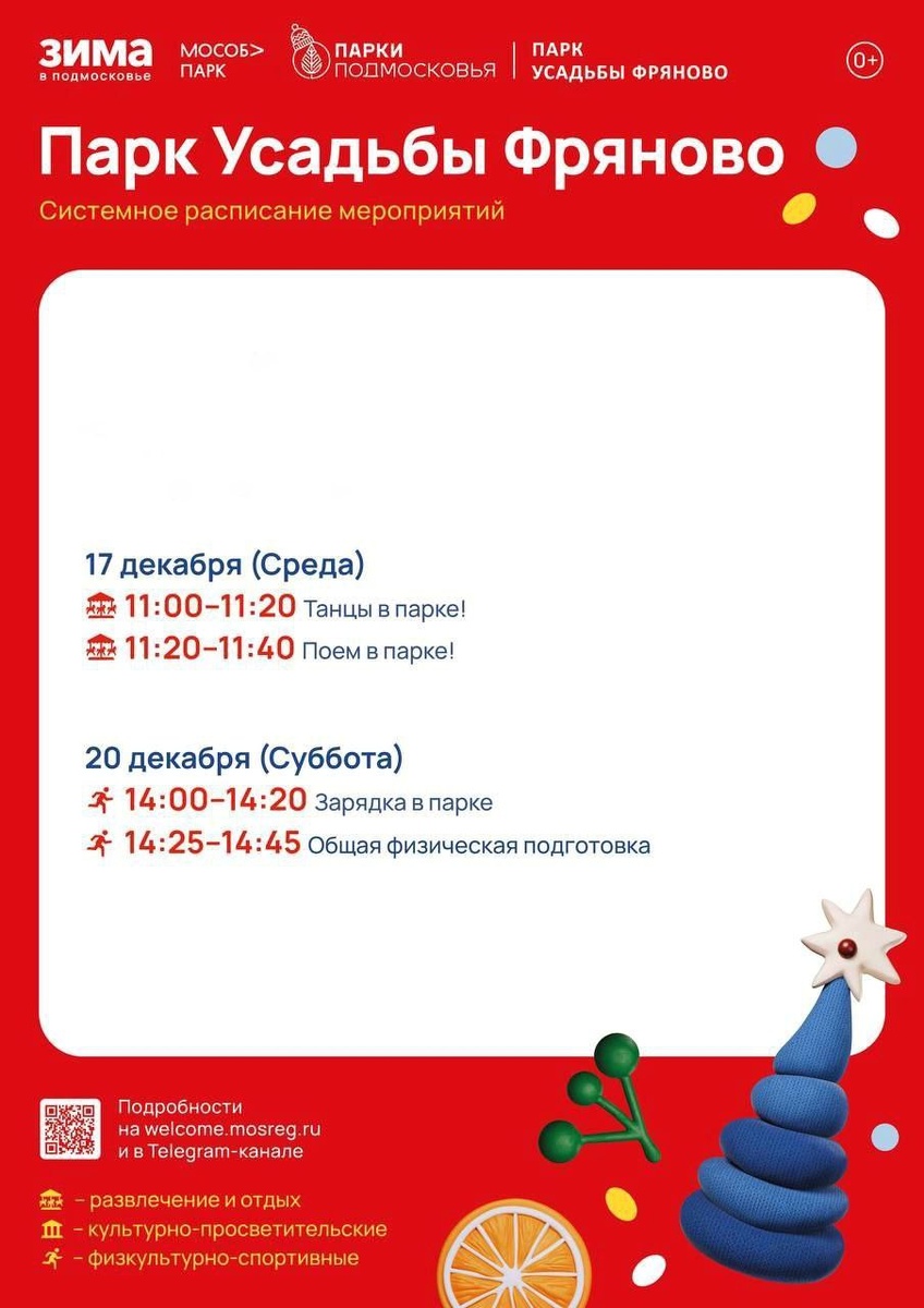 ⬇️ ❄ Среда | 17 декабря - С 11:00 до 11:20 — Танцы в парке. - С 11:20 до 11:40 — Поем в парке. ❄ Суббота | 20 декабря - С 14:00 до 14:20 — Зарядка в парке. - С 14:25 до 14:45 — ОФП (общая физическая подготовка). ⭐️ Не упустите возможность зарядиться энергией и провести время с пользой! #культуращёлково #зимавподмосковье