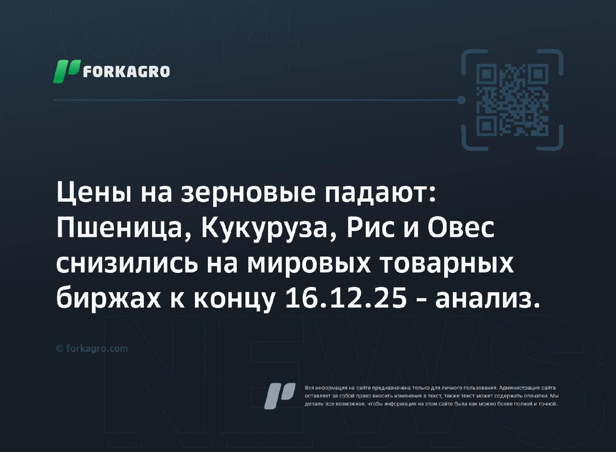 Цены на зерновые падают: Пшеница, Кукуруза, Рис и Овес снизились на мировых товарных биржах к концу 16.12.25 - анализ