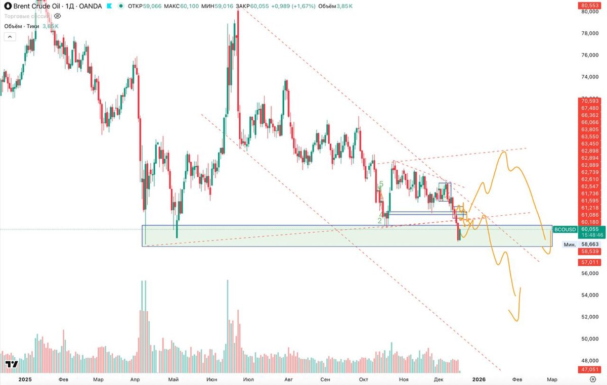 Нефть. Основной план актуален - после ретеста 60,5-61 снизу полагаю продолжение движения к 45-50...