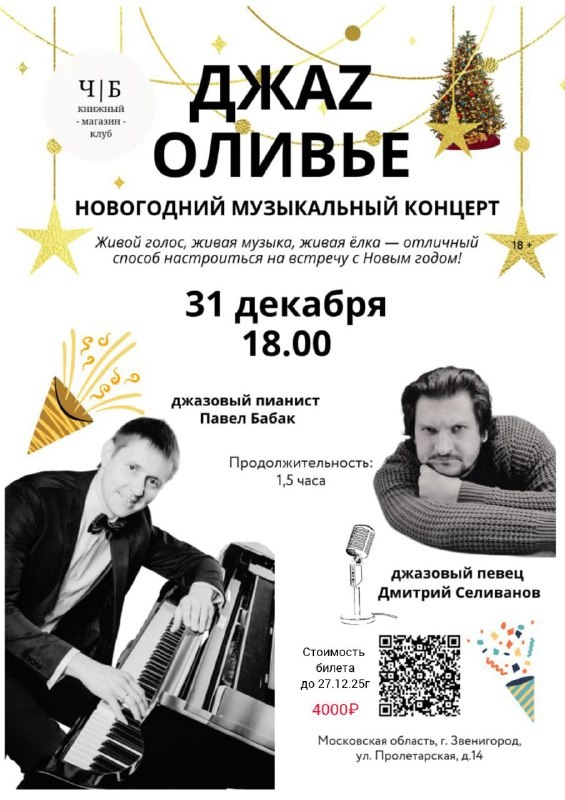 " новогодний музыкальный концерт с фуршетом 🎉 18+ Джазовый певец Дмитрий Селиванов и джазовый пианист Павел Бабак Живой голос, живая музыка, живая ёлка🎄 — отличный способ настроиться на встречу с Новым годом! Дресс-код: вечерний 💃🕺 На концерте прозвучат новогодние джазовые стандарты из репертуара: 🎤Фрэнка Синатра 🎤Нэт Кинг Коула 🎤Рэя Чарльза 🎤Майкла Бубле 🎤и, конечно, произведения советских и российских авторов Успевайте забронировать себе место! Ранняя цена 3600р — до 1 декабря Средняя цена 3800р — до 15 декабря Поздняя цена 4000р — до 27 декабря Супер-поздняя цена 4200₽ — до 30 дека ❗ОСТАЛОСЬ 10 МЕСТ Успеть КУПИТЬ БИЛЕТЫ 🤫 Только для наших подписчиков скидка 7% при покупке билетов на кассе книжного. До встречи в нашем душевном, уютном арт-пространстве книжного магазина-клуба Ч|Б! 31 декабря в 18.00 | Ср Продолжительность: 1,5 часа 20 мест (свободны 11❗) 📍Московская область г. Звенигород, ул. Пролетарская, 14 (вход напротив остановки Магазин N3) #КонцертыЧБ #