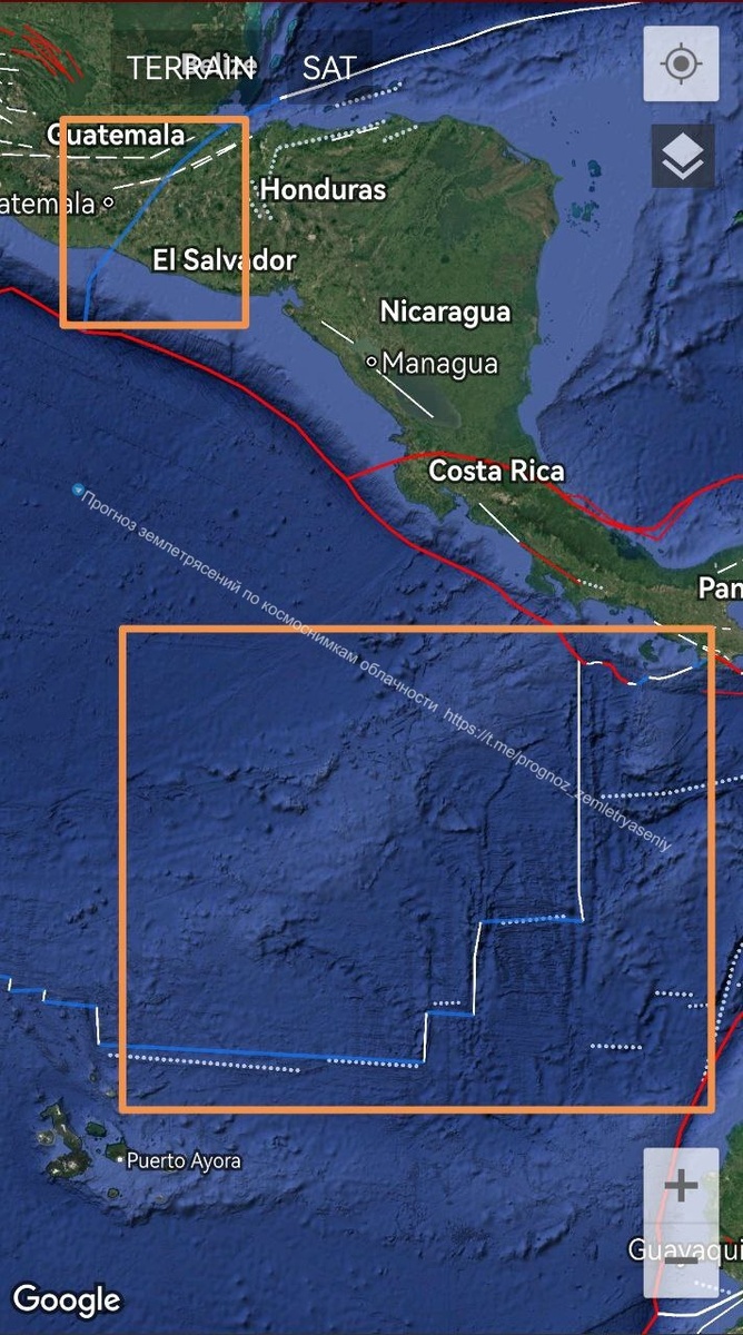 Гватемалы/Мексики (М6) ====== The southeastern part of the Cocos plate is under tectonic stress, where the rift zone from Panama to the Galapagos islands(M7), as well as the zone off Guatemala/Mexico (M6), are traced with a shift of the CSTI.