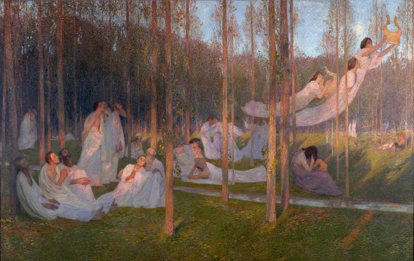 Представленное на Салоне Французского общества художников в 1899 году, это монументальное (367 на 544 см) полотно изображает Елисейские поля, о которых говорил латинский поэт Вергилий в своей «Энеиде». На нём изображены счастливые души, которых судьба привела к блаженству, в сопровождении ангелов-музыкантов направляющиеся в Аркадию, страну спокойствия и безмятежного счастья. За символистской идеей, пронизывающей сцену, скрывается попытка эстетического синтеза новейших художественных тенденций. Действительно, выразительный мазок кисти, четко выраженный, заимствован из натуралистического движения, которое, в свою очередь, позаимствовало его у импрессионизма. Однако при этом он утратил свою роль возвышения света и стал лишь средством для придания краске вибрационного эффекта. Анри Мартен (1860–1943), написавший эту картину, создал множество подобных работ на холсте или в качестве декоративных элементов. Среди прочих, его резко критиковал Эдгар Дега (1834–1917), считавший, что Мартен