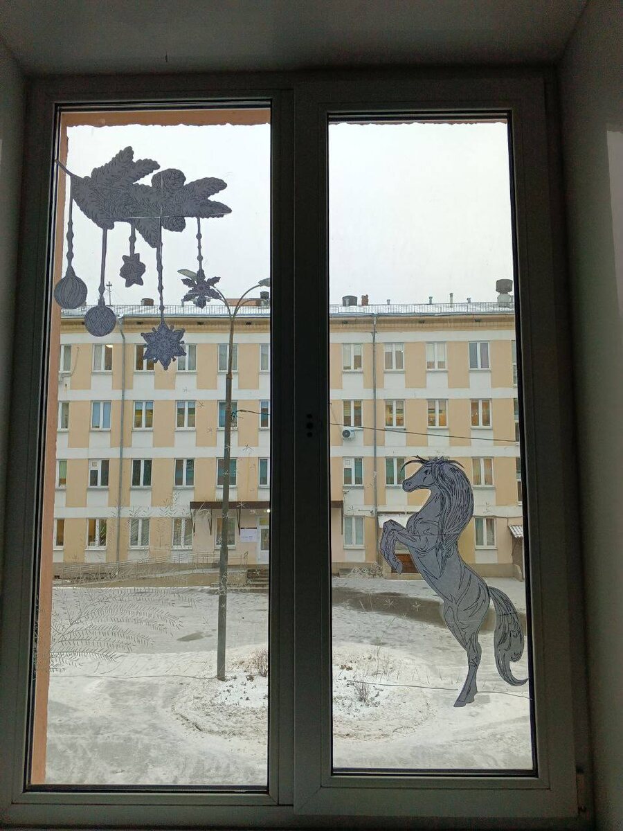 В рамках акции «Новогодние окна» активисты движения первых украсили окна в коридорах школы яркими рисунками и декоративными композициями на
