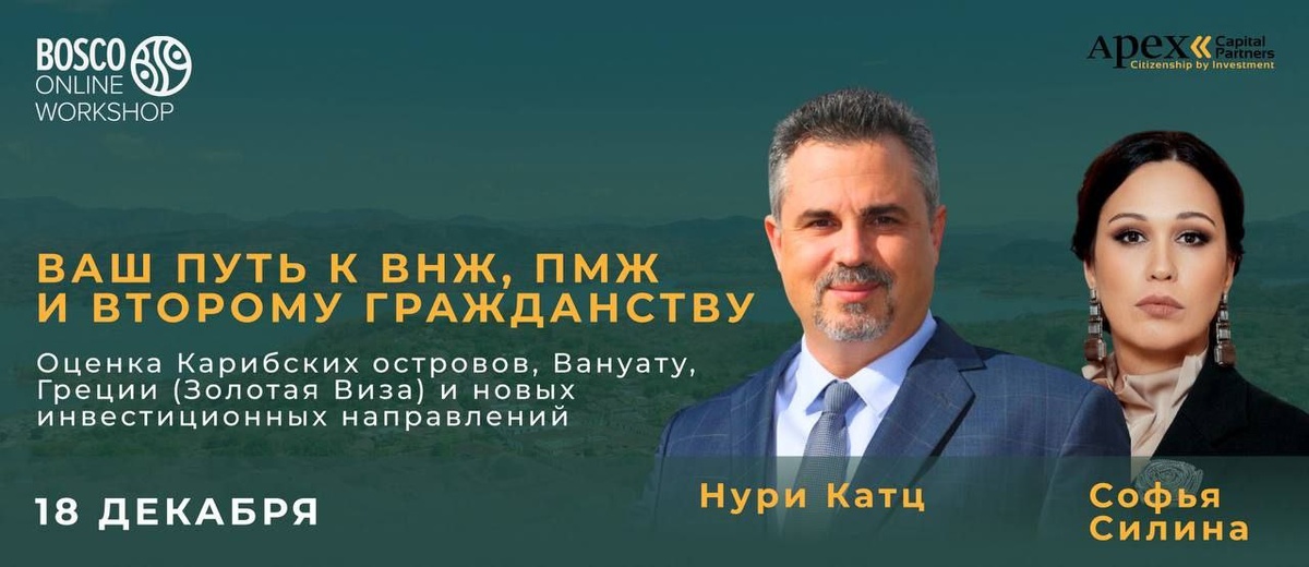 18 декабря в 15:00 по Мск| GMT+2| 17:00 Алматы. Бесплатный вебинар от APEX. В прямом эфире Нури Катц, Президент APEX, и Софья Силина, Вице-президент по РФ/СНГ расскажут о самых актуальных программах для инвесторов. Как защитить активы и получить свободу перемещения по миру? ▫️ Какие варианты получения гражданства и ВНЖ есть для тех, кто не готов реплицироваться ради участия в программе. ▫️ Какую программу гражданства выбрать? Новинки 2025 года и проверенные «игроки». ▫️ Каковы реальные сроки оформления и есть ли риски? Реальные кейсы. ▫️Альтернативный паспорт для бизнесменов: когда важен нейтральный статус. ▫️Кому и что можно? Инвестиционное Гражданство и ВНЖ – ограничения для участия. ▫️Гражданство за криптовалюту и подтверждение дохода в крипте – какие правила. ▫️Второе гражданство для всей семьи. Образование детей, безопасность, новые возможности. Обсудим Карибское гражданство, программу Сальвадора, Сан-Томе и Принсипи, Вануату, ВНЖ Греции, ПМЖ Панамы, ПМЖ Кипра и не только. У