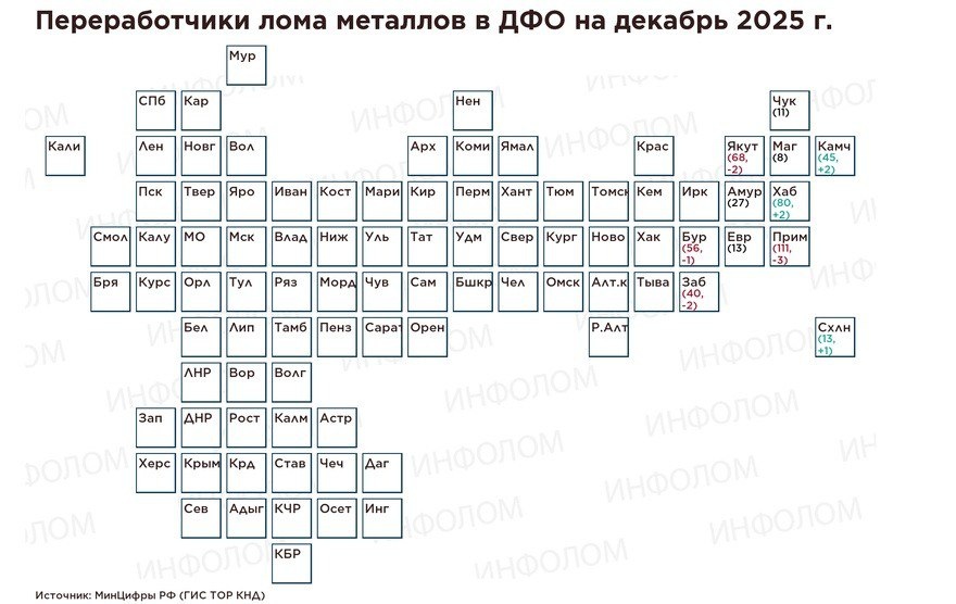 Рынок переработки металлолома на Дальнем Востоке по итогам 2025 года демонстрирует сдержанную и неоднородную картину. В отличие от других федеральных округов, здесь преобладает тенденция к стагнации и сокращению числа операторов, что, вероятно, отражает как географическую специфику, так и макроэкономические вызовы. Центром деловой активности в отрасли, несмотря на незначительное сокращение, остаётся Приморский край (г. Владивосток). Здесь количество лицензированных компаний уменьшилось на три, однако общее число участников — 111 — сохраняет за краем лидерство в ДФО. Сокращение числа игроков стало доминирующим трендом для крупных материковых регионов. В Республике Саха (Якутия) (г. Якутск) рынок сократился на две компании, составив 68 участников. Аналогичное снижение на две фирмы зафиксировано в Забайкальском крае (г. Чита), где работают 40 переработчиков. На одну компанию меньше стало в Республике Бурятия (г. Улан-Удэ) — теперь их 56. Однако на карте Дальнего Востока есть и точки рос