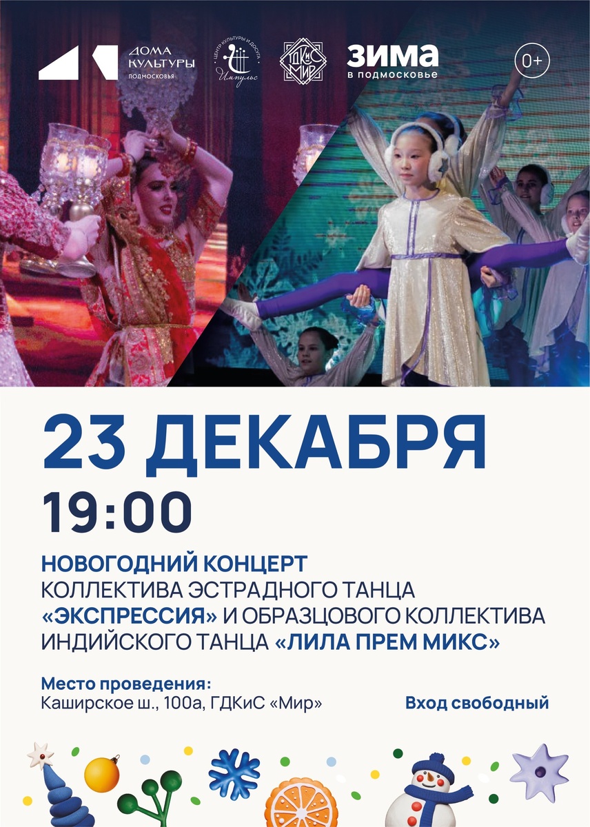 ✨ 🌟 Дорогие друзья! Новый год уже на носу, и мы с радостью приглашаем вас на яркий отчетный концерт! 🔥 В малом зале ГДКиС «Мир» вы сможете увидеть выступления коллектива эстрадного танца «Экспрессия» и ансамбля индийского танца «Лила Прем микс». 🎉 Это будет незабываемый вечер, полный танцев, музыки и новогоднего настроения! Вход свободный! Не забудьте пригласить друзей и близких! 💞 🚫 Возраст: 0+ 📆 23.12.2025🕒19:00 🏢 Дворец культуры и спорта «Мир» 📍 г. Домодедово, Каширское шоссе, д.100А 💰 Вход свободный❗️ ✅ Мероприятия Домодедово https://dzen.ru/id/66f10385cc4c5a16f7b5fb02 http://vk.com/domodedovo_events http://dzen.ru/domodedovo_events