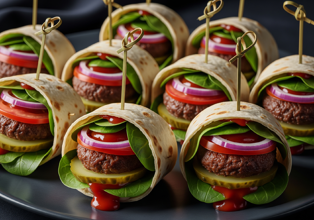Слушайте, я тут открыл секретный способ, как не провести все 31 декабря, согнувшись над тазом с салатом. Один мой знакомый — большой любитель фастфуда и ленивого отдыха — однажды психанул и вместо того, чтобы лепить классические бургеры с булками-размазнями, завернул всё в лаваш. И знаете что? Это была кулинарная революция! Теперь этот «фирменный номер» заставляет гостей хохотать от восторга, пока они хватают эти шпажки одну за другой. Никаких крошек, никакого майонезного болота на тарелке и, что самое приятное, никакой тяжести в животе. Весь фокус в том, что мы берем классику — сочную говяжью котлетку, хрустящий огурчик и лук — и «пеленаем» их в тонкий лаваш, как родных. Получается такая компактная радость на один-два укуса. Секрет сочности тут в соусе: мешаем кетчуп, майонез и горчицу до состояния «того самого вкуса» из сетевых закусочных. А чтобы котлетки не развалились и не превратились в кашу, их надо хорошенько отшлепать ладонями — устроить им настоящий сеанс массажа перед сково