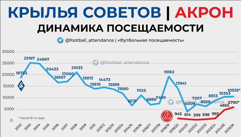 Продолжу рубрику региональных противостояний. Первая часть собрала рекордное количество дизлайков из-за вероятно ошибочного объединения истории старой и новой «Кубани» на одной инфографике. Сегодня, к счастью, разбираться в правопреемственности не придётся. Подробно о зрительской аудитории «Крыльев» в XXI веке можно прочесть в отдельном материале. Главный тезис, связывающий самарский клуб и болельщицкий интерес, это «Самый посещаемый клуб Восточной Европы». Действительно, в сезонах 2003 и 2004 со средней посещаемостью ~25 тысяч зрителей «Крылышки» с запасом были самым посещаемым клубом России и, собственно, Восточной Европы в границах как географического, так и политического деления. «Акрон» всё ещё гораздо менее популярен, несмотря на второй сезон в РПЛ. За шесть лет в профессиональном футболе клубу удалось дойти до высшего дивизиона, и в дебютном сезоне собрать на трибунах 4655 зр./матч. Пожалуй, это первый клуб в Самарской области, который может навязать конкуренцию главному футбол