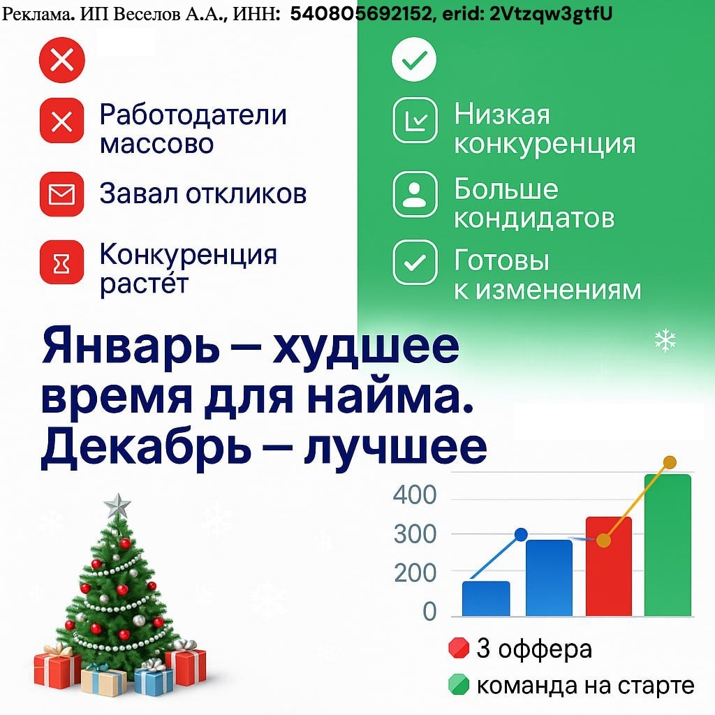 Декабрь — лучше См. кейс подбора удалённого менеджера по продажам от 10 января 2025. После публикации получил несколько сообщений: «А разве в декабре вообще имеет смысл запускать подбор?» Отвечаю — не просто имеет, а часто это лучший момент. ❌ Что делают большинство компаний Откладывают подбор до января. Логика понятна: — праздники, — все «проснутся» после 10–15 января, — начнём по-нормальному. Но на практике январь — плохой месяц для найма (хуже только начало августа): 📈 работодатели массово выходят на рынок 📩 соискателей заваливают предложениями 🏆 сильные кандидаты выбирают лучшие условия ⏳ растёт конкуренция и стоимость ошибки ✅ Что делают более дальновидные компании Они нанимают в декабре. Почему это работает: ✔️ конкуренция среди работодателей ниже ✔️ кандидатов больше, чем кажется ✔️ люди подводят итоги года и готовы к изменениям ✔️ внимания соискателей — в разы больше 📊 Факты из декабря 2024 (реальный кейс) — 20 вакансий в 20 городах — 404 входящих отклика — 8