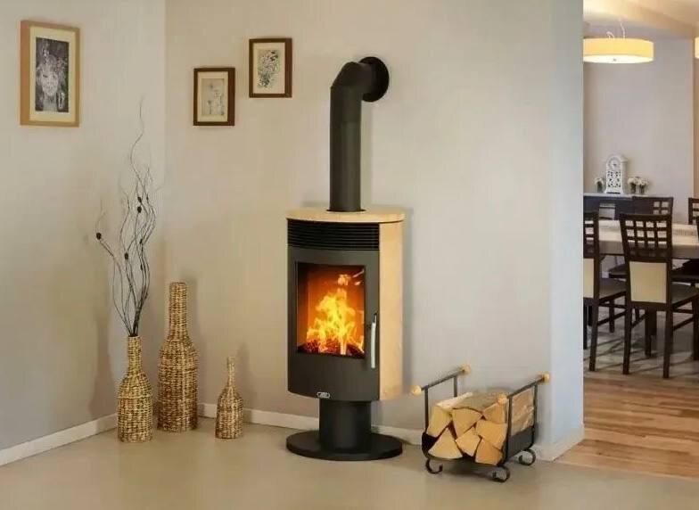 Недорогая печь с красивым огнём, поворотным корпусом и облицовкой из камня — смотрите в деле