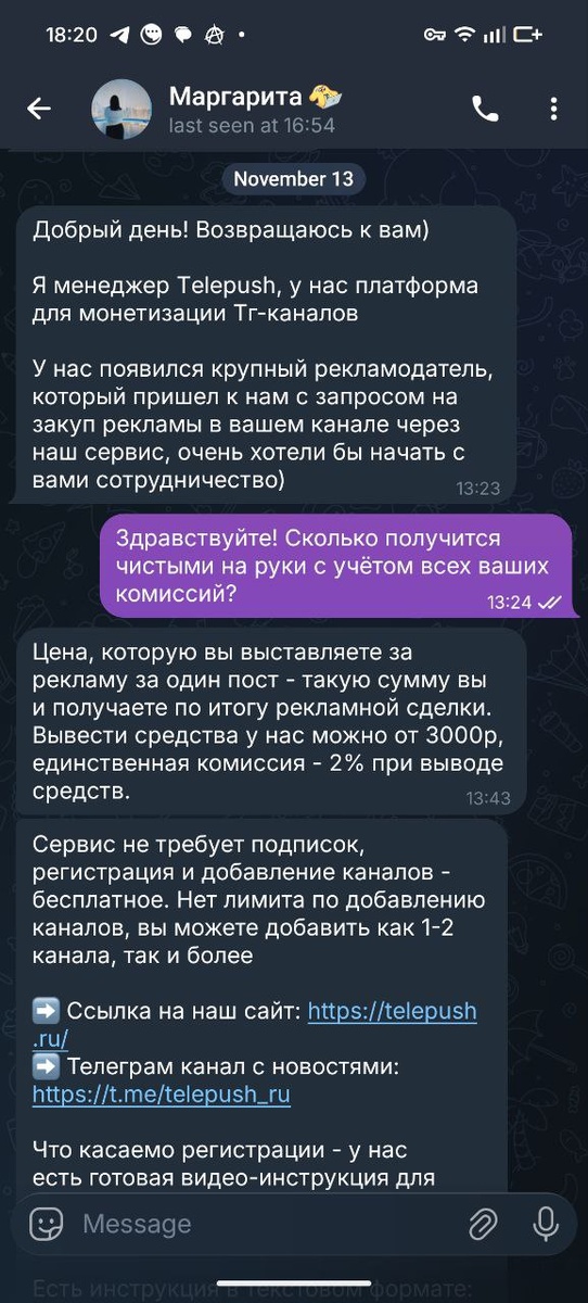 Если вы автор канала и вам пишут из сервиса Telepush с формулировкой "У нас появился крупный рекламодатель, который пришел к нам с запросом